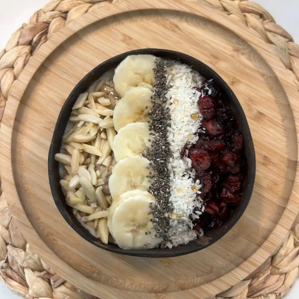 Coconut milk, banana, dried cranberries, almonds, coconut & agave