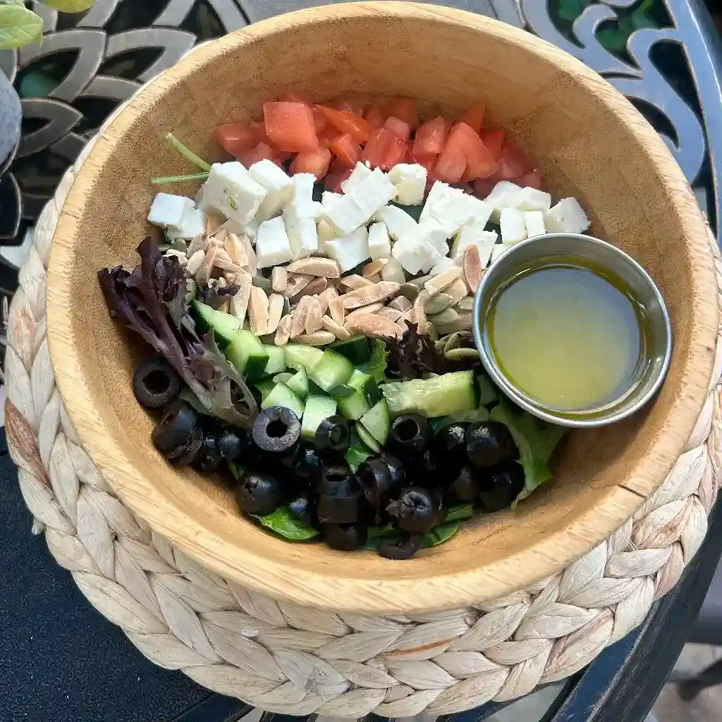 Mix greens, mozarella, black olives, cucumber, tomato, almonds, pumpkin seeds & our lemon house dressing on the side.